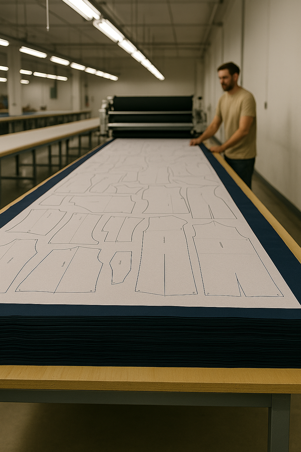 Kesim işlemine başlamadan önce, kumaşlar kat kat serilerek pastal hazırlanır. Üzerine, modelin kalıp planlarını içeren marker kâğıdı yerleştirilir.